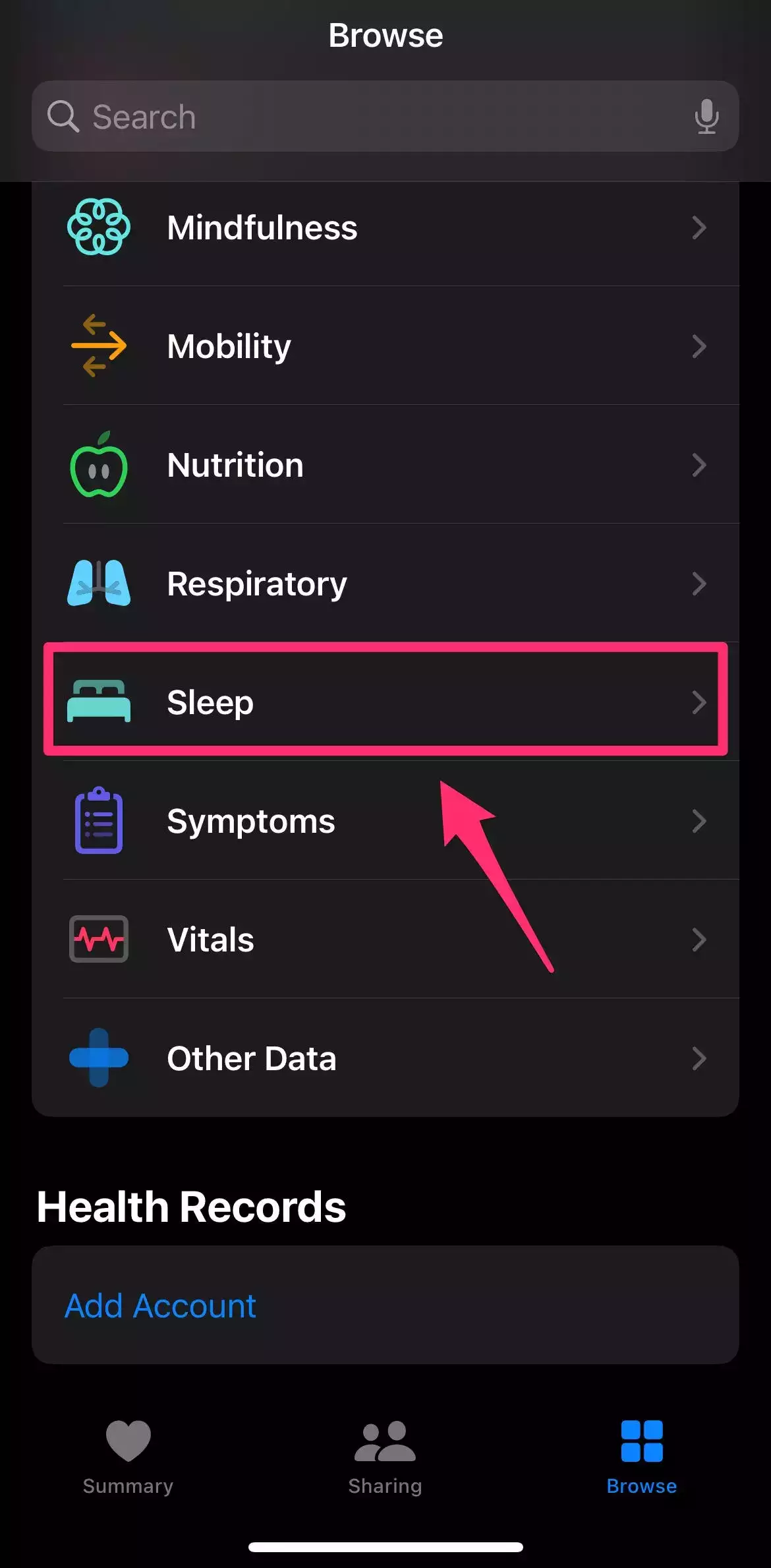 1.在 iPhone 上打开健康应用程序。点击屏幕右下角的浏览,然后点击睡眠。