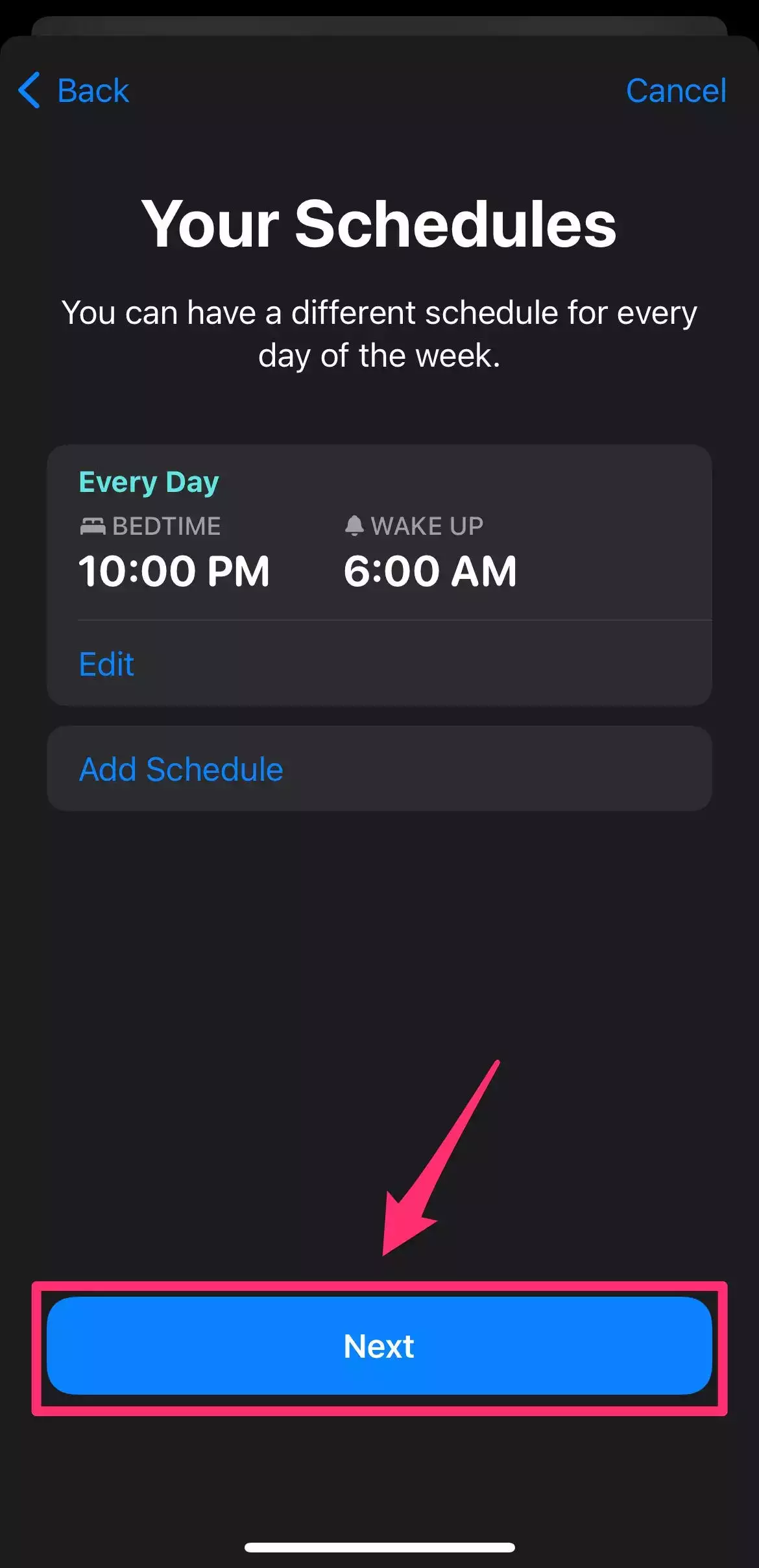 5.点击添加时间表添加另一个睡眠时间表。完成后,点击Next。