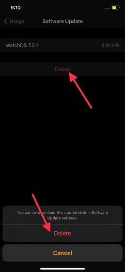 5.最后,再次点击“删除”以确认您要删除Apple Watch软件更新。