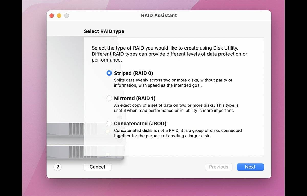 Disk Utility 允许您创建 RAID 0(条带化)、RAID 1(镜像)以及 Apple 所谓的“Concatenated JBOD”磁盘。磁盘工具还包括一个 RAID 助手。有关使用磁盘工具在macOS中设置软件控制的 RAID 磁盘的更多信息,请参阅此页面。