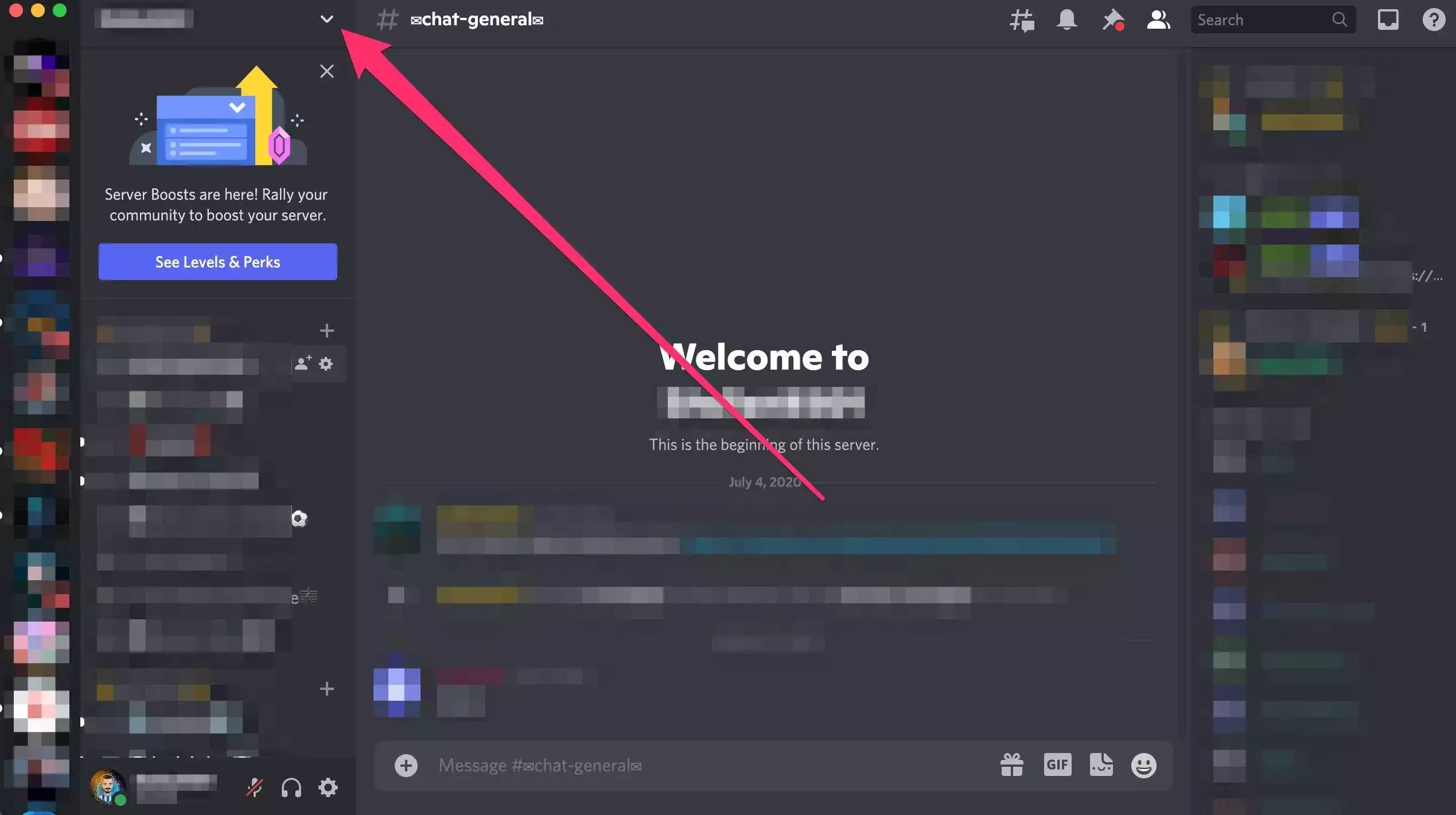 2 . 在具有要删除的自定义表情符号的 Discord 服务器中,单击服务器名称旁边的下拉箭头。