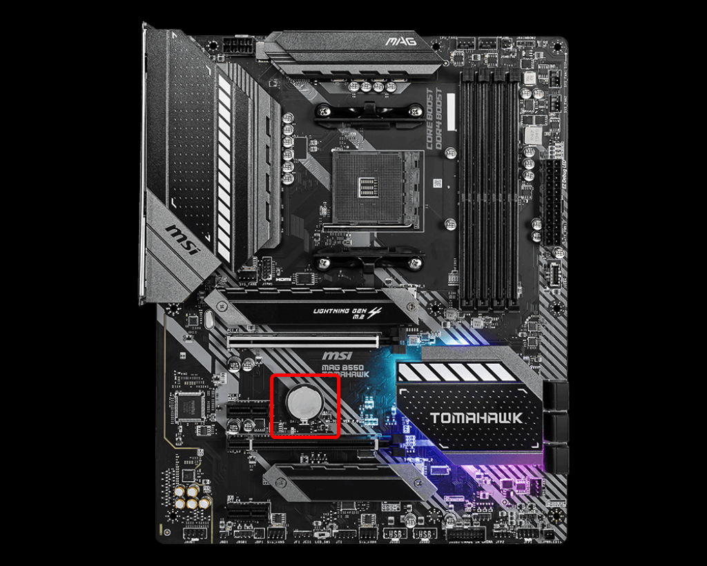 在打开电脑机箱之前,请尝试在线搜索主板照片(如果您知道自己的主板型号)。找到照片后,寻找一个圆形的银色东西,通常位于主 PCIe 插槽下方。您可以在下面看到流行的B550主板上的CMOS电池位置,微星B550战斧。如您所见,CMOS电池很容易被发现。