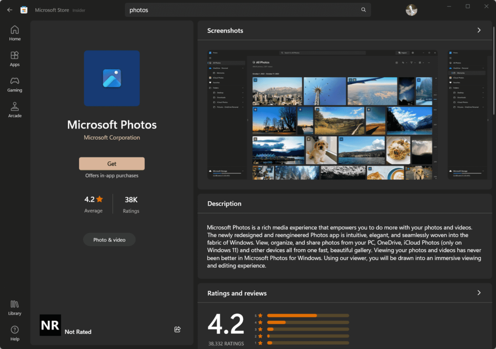 如果您改变主意并想要重新安装“照片”应用,可以通过 Microsoft 商店进行。在 Microsoft Store 中搜索“Microsoft Photos”,然后单击“获取”按钮。
