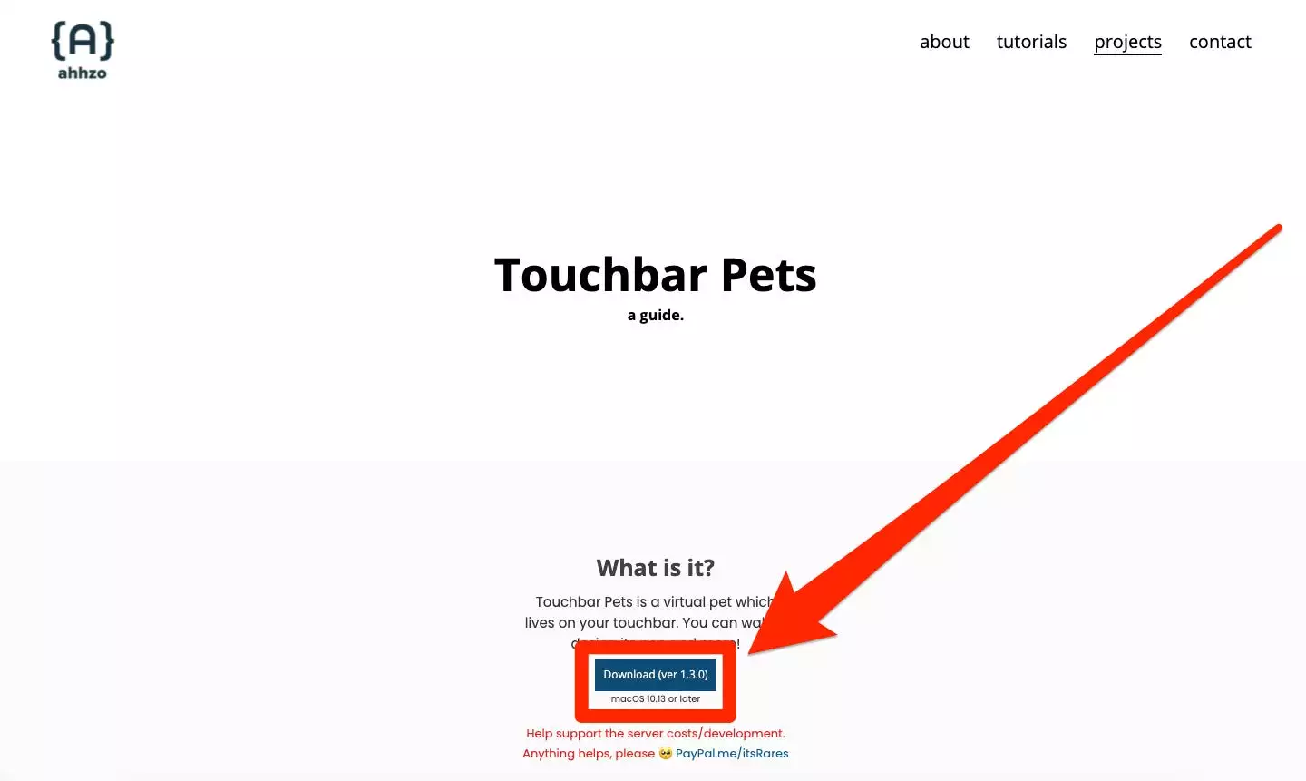 1.访问Touchbar Pets 主页并单击蓝色的“下载”按钮。