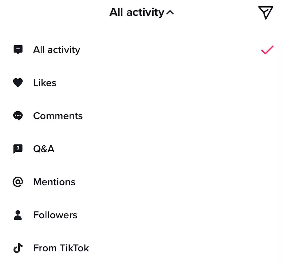 3.在这里,您可以过滤通知以显示哪些帐户喜欢您的视频、评论您的视频、关注您或提及您。