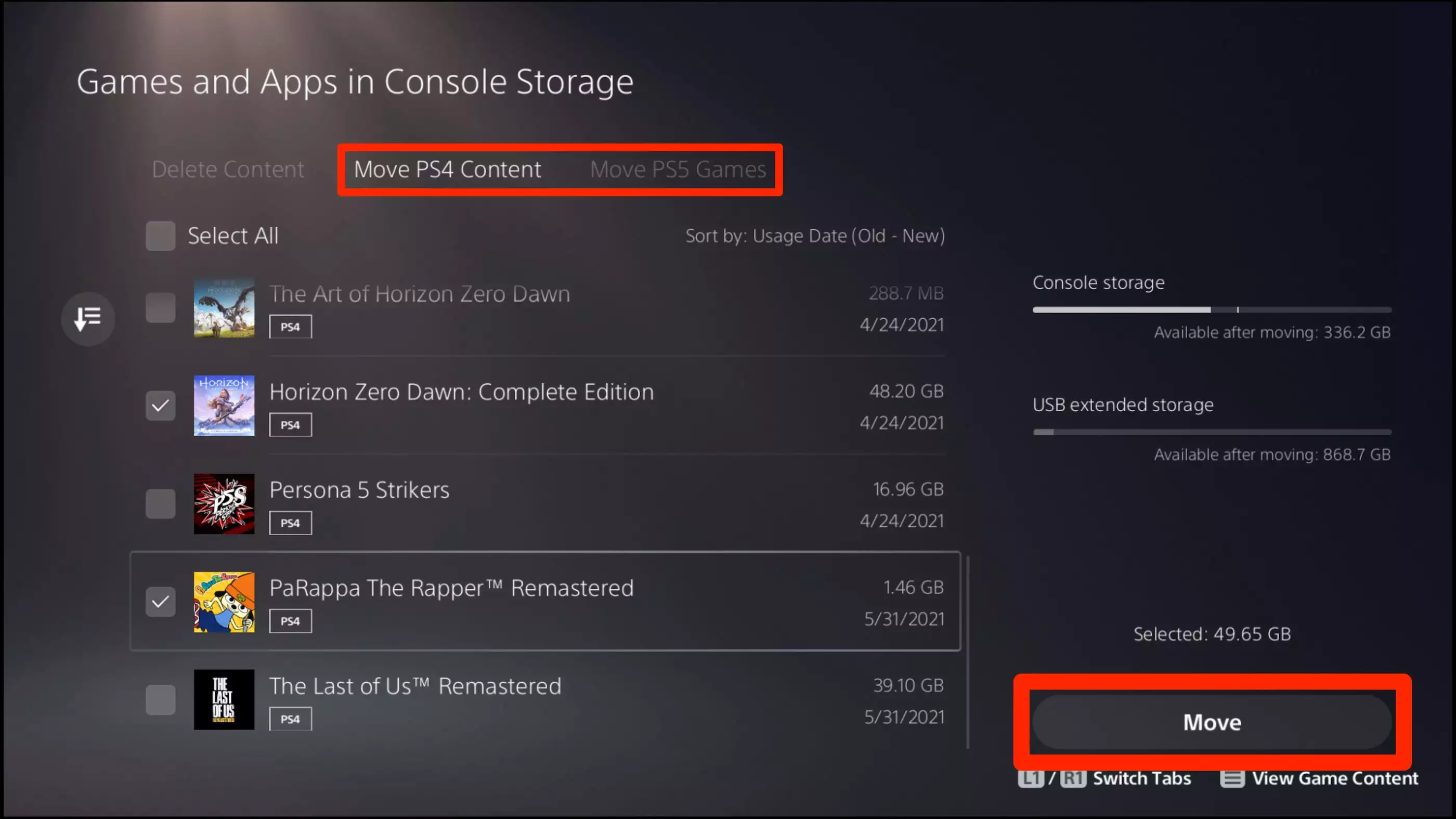 4.将出现一个包含所有游戏列表的新菜单,分为两个选项卡:移动 PS4 内容和移动 PS5 游戏。浏览这些选项卡并选择您要移动的所有游戏,然后选择右下角的移动。