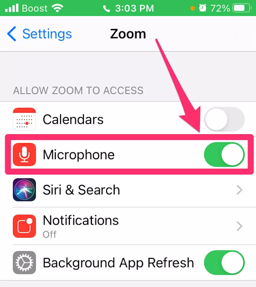 您可能还想确保 Zoom 有权使用麦克风,这可以通过您的手机设置进行访问。在 iPhone 上,导航到缩放应用 在您的设置中,然后确保麦克风选项已打开。