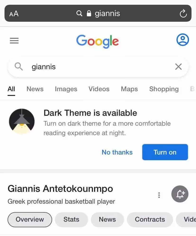 启用后,您的搜索结果页面将切换到深色主题,如 iPhone 的 Safari 浏览器上所示。