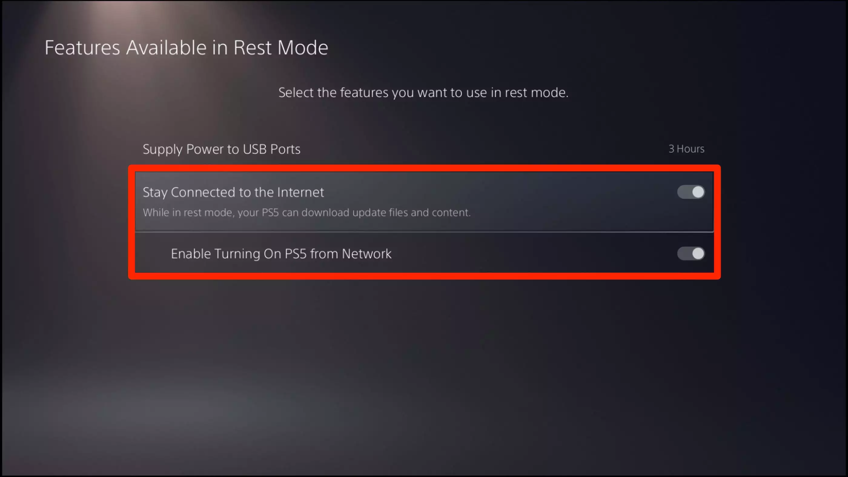 5.打开保持连接到 Internet和启用从网络打开 PS5旁边的开关。