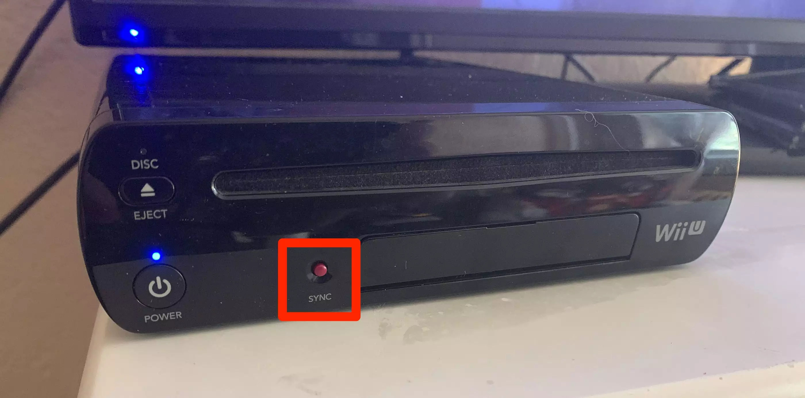 1.打开你的 Wii 并打开控制台前面的 SD 卡盖找到 SYNC 按钮。这是一个深红色的方块。