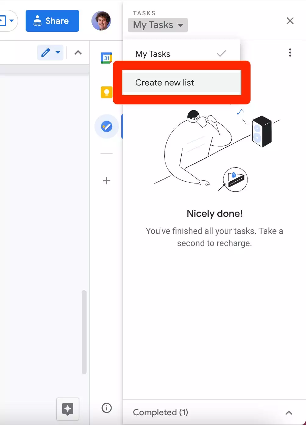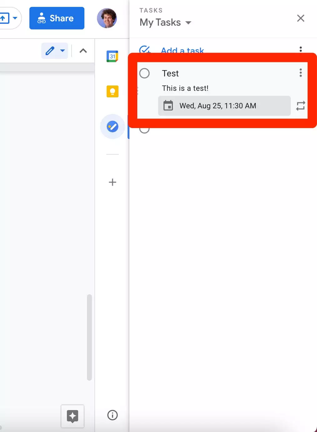 但是,在计算机上,Google Tasks 只是其他应用程序的附加组件 谷歌应用. 当您使用 Google Workspace 应用程序(包括 Gmail、Google 日历、Google 云端硬盘等)时,请点击屏幕右侧的“任务”图标。