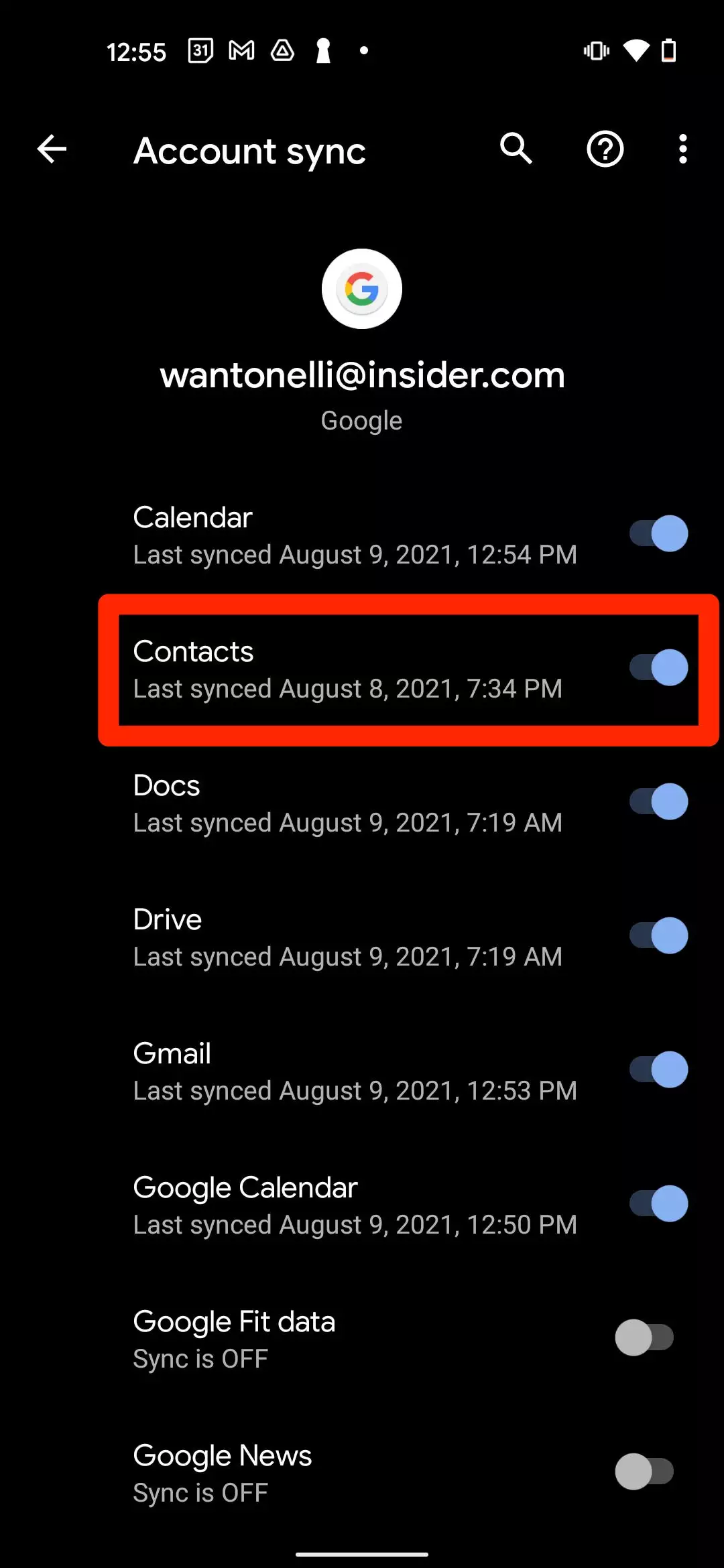 4.在打开的页面上,确保已启用联系人。这将确保您手机的所有联系人都保存到 Google 帐户中。