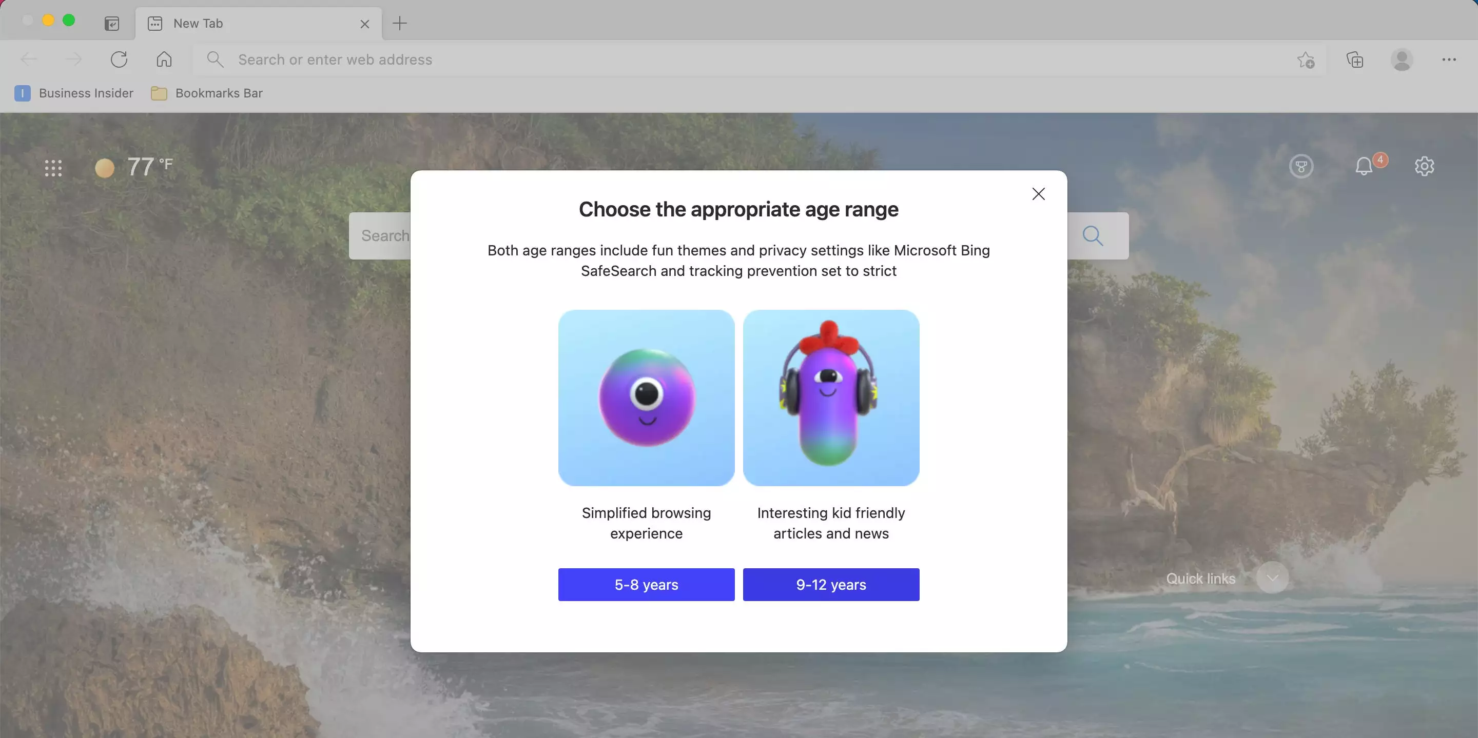 2.在出现的弹出窗口中,单击开始使用,然后选择您孩子的年龄。选择5-8 岁会给你一个图标较少的浏览器,而选择9-12 岁会给浏览器的主页添加一些适合年龄的新闻文章。