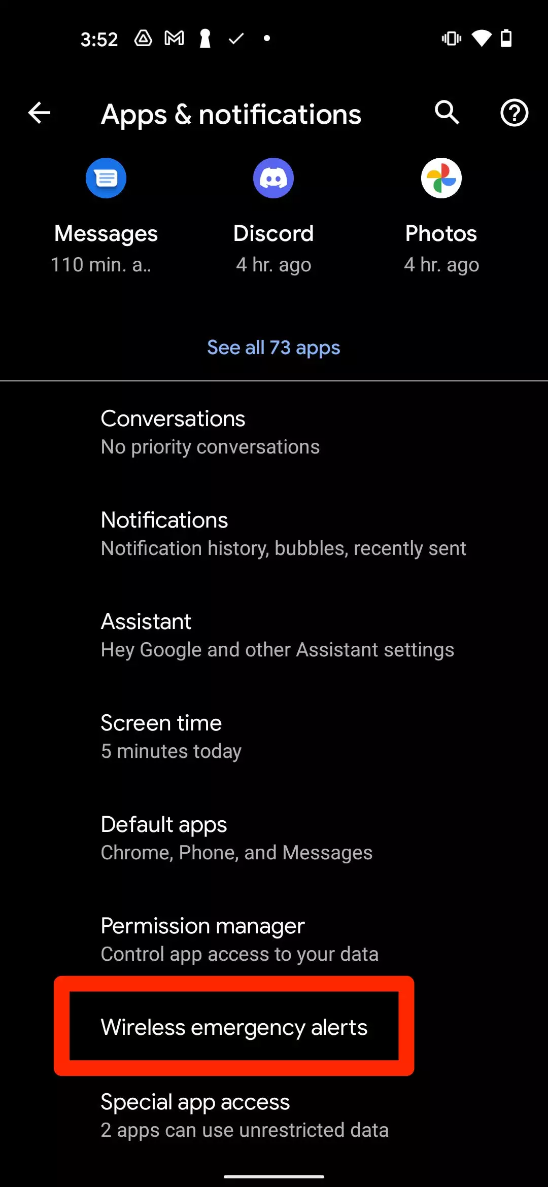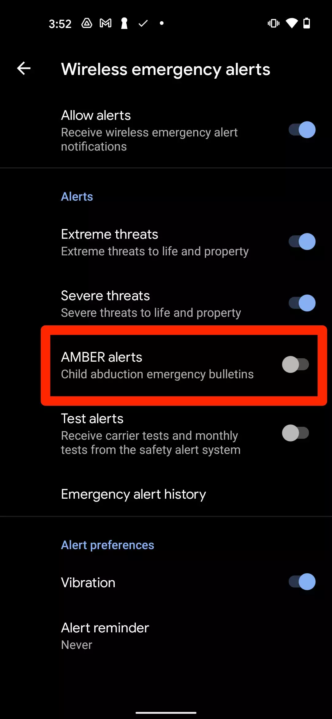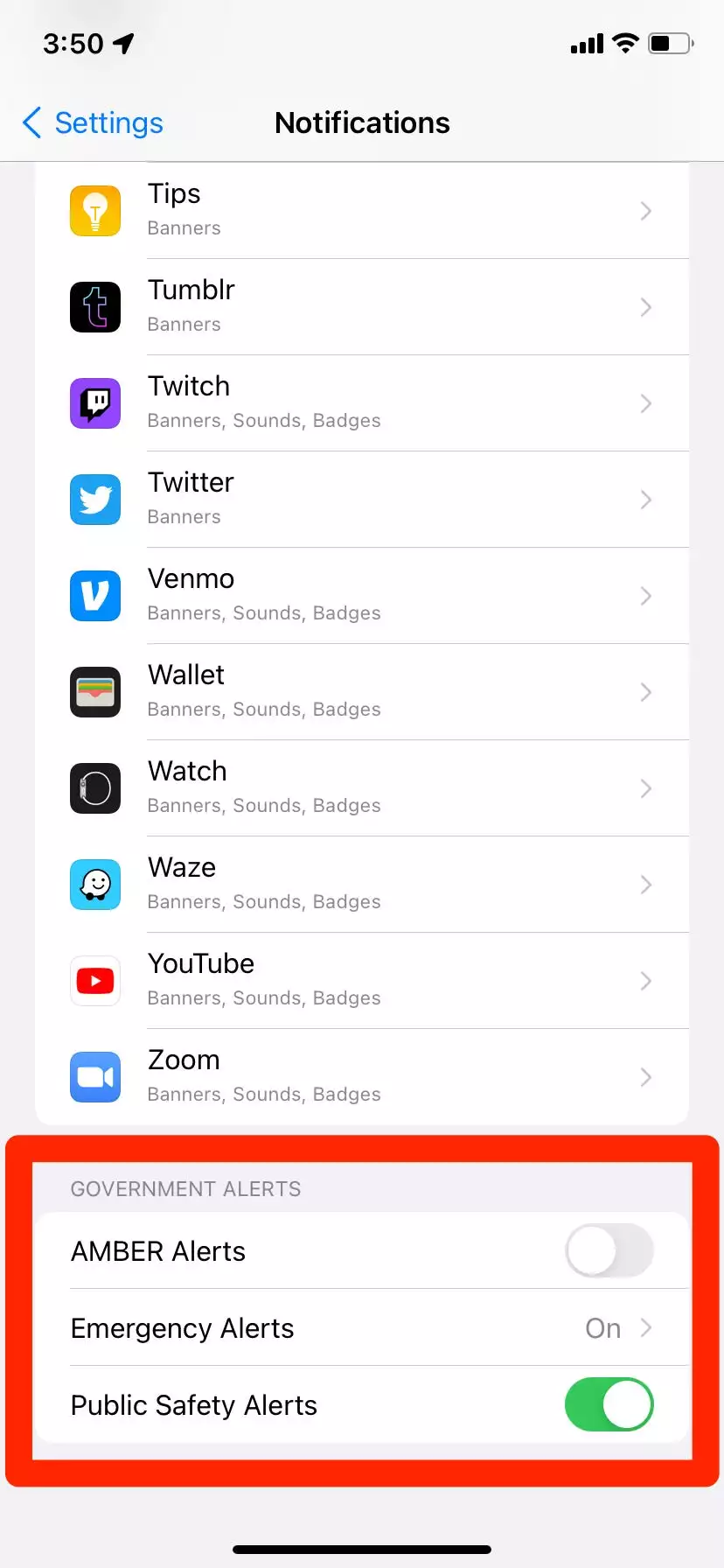 2.向下滚动到政府警报部分。在这里,您可以关闭琥珀色警报以及紧急和公共安全警报。