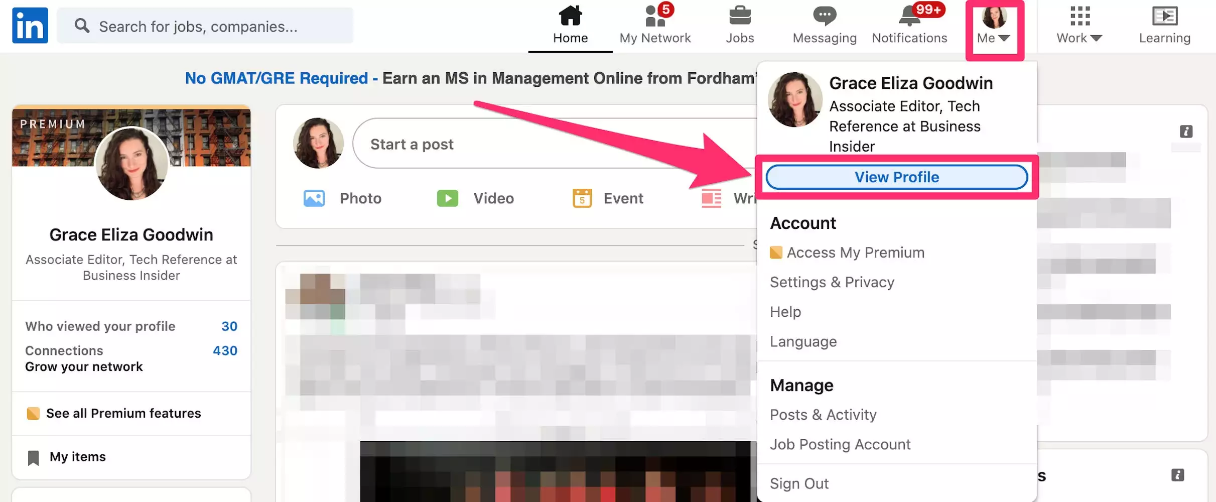 1.在LinkedIn 网站的主页上,单击右上角的“我”按钮并在下拉列表中选择“查看个人资料”,转到您的个人资料页面。