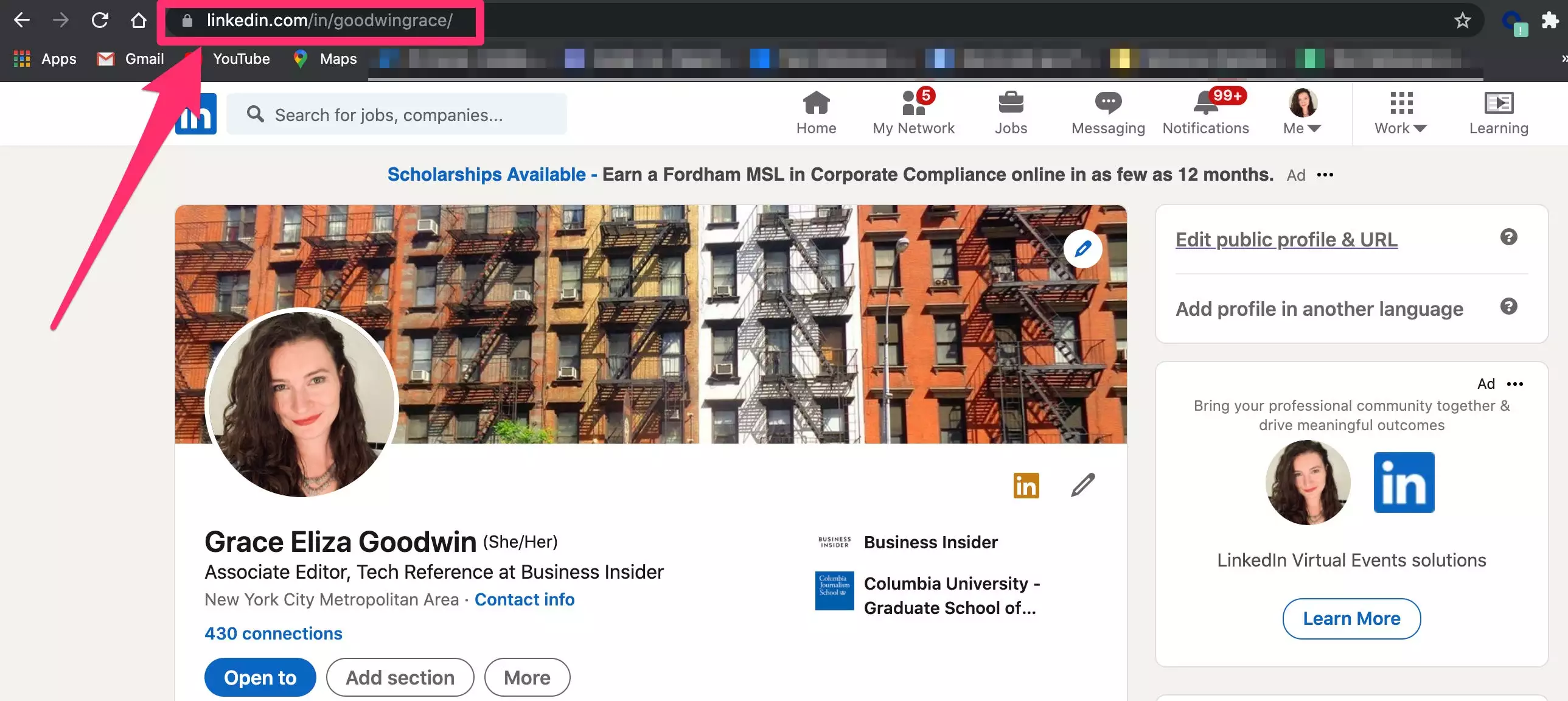 4.加载您的配置文件后,查看 Web 浏览器顶部的 URL 栏。那里的 URL 是您的 LinkedIn URL。