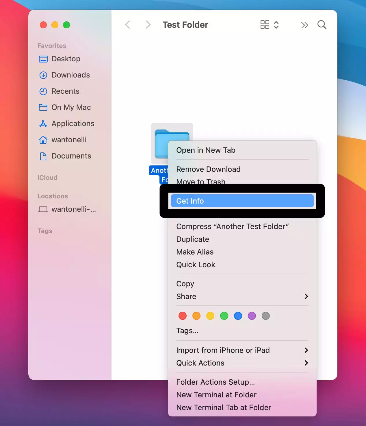 3.找到要更改图标的文件夹(或文件或应用程序)并右键单击它,然后选择“获取信息”。