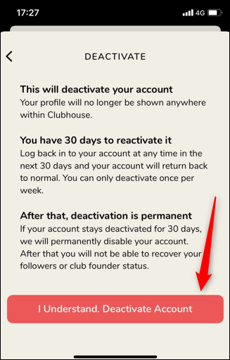 永久删除您的 Clubhouse 帐户并进而删除您的数据的过程并不像删除您的Facebook 帐户那么简单, 永久删除它的选项位于用户设置中的停用按钮正下方。删除您在Twitter 上的帐户也是如此 ,这实际上会在停用 30 天后删除您的所有用户数据。