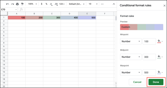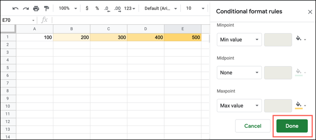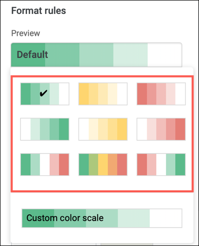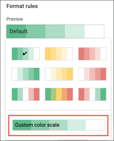 也许你想为你的秤使用特定的颜色。它可以是您的学校颜色或您公司徽标中的颜色。Google 表格可让您完全按照自己的喜好定制色阶。