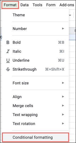如果您想在 Google 表格中快速应用色阶,可以使用九个预设之一。通过单击第一个单元格并拖动其余单元格来选择要设置格式的单元格。然后,前往菜单中的格式并选择“条件格式”。