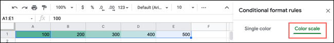 这将打开条件格式规则侧栏,您将在其中设置所需的一切。在边栏的顶部,单击色阶选项卡。您将立即看到应用了默认色阶的所选单元格。这为您提供了一个很好的示例,说明您的数据在渐变中的外观。