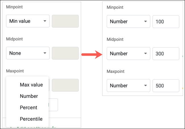 默认情况下,这些值在没有中点的情况下使用色标的最小值和最大值,但您可以在下一个区域调整这些值。您可以为每个选项选择一个数字、百分比或百分位数,并包括中点(如果适用)。然后,在右侧的框中键入这些其他选项的值。