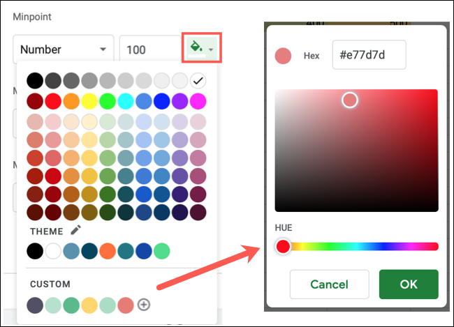 在每个值 Minpoint、Midpoint 和 Maxpoint 的右侧,使用颜色按钮显示调色板。您可以选择一种颜色或单击底部的“自定义”。然后,输入十六进制代码或使用滑块和阴影工具获取所需颜色。