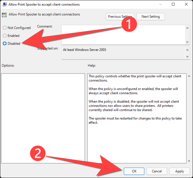 关闭组策略编辑器。在此之后,您需要重新启动 Print Spooler 服务以使更改生效。