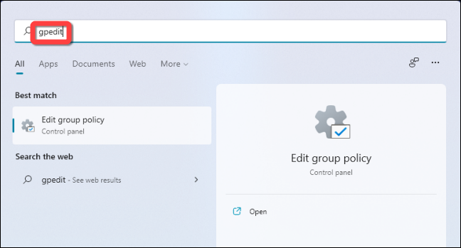 单击开始,在搜索框中键入“gpedit”,然后按 Enter打开组策略编辑器。