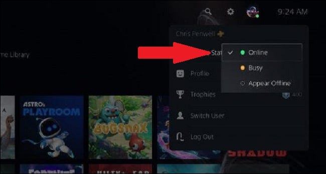 您还可以通过转到主菜单的右上角并单击您的图片来更改您的个人资料状态。如果您不想被打扰,请按 X 查看您的在线状态设置并向下移动光标以显示“在线”、“离线”或“忙碌”。