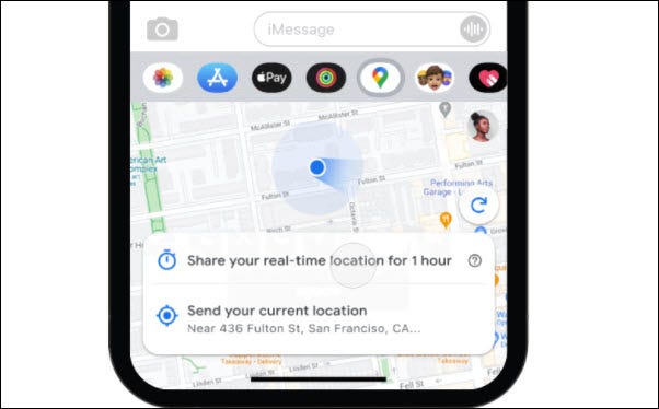 要访问此功能,您需要点按 iMessage 中的 Google 地图按钮。从那里,将出现一个预览,让您知道您的位置将被共享多长时间。从那里,点击发送按钮,您的朋友将能够跟踪您。