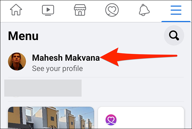 Facebook 将打开一个“菜单”屏幕。在这里,点击顶部的个人资料。
