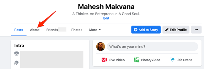 在您的个人资料页面上,从您姓名下方的选项卡栏中,选择“关于”选项卡。