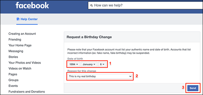 这可以通过 Facebook 在其网站上提供的表格来实现。使用此表单,您可以向 Facebook 发送修改个人资料中生日的请求。然后由 Facebook 来接受或拒绝您的请求。