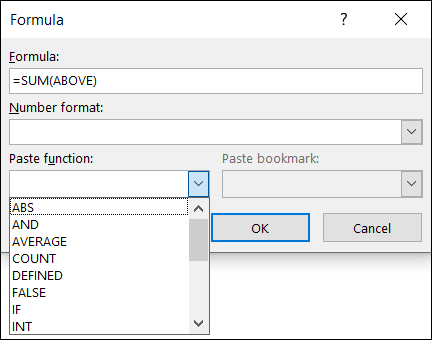 与 Excel 类似,Word 会尝试检测您正在尝试执行的操作。因此,您可能会看到一个通用公式(例如 SUM)已填充并准备就绪。