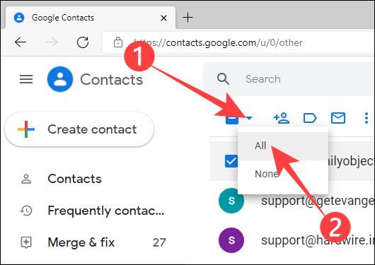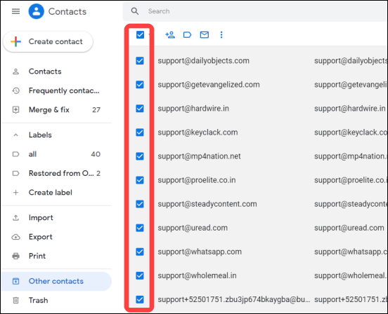 这将选择“其他联系人”列表中的所有电子邮件地址。之后,您可以取消选择要保留的联系电子邮件。