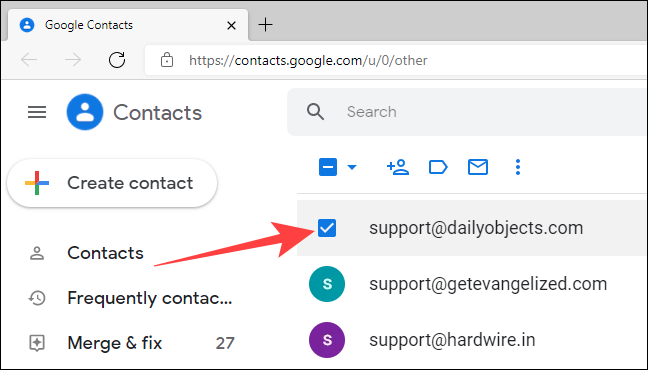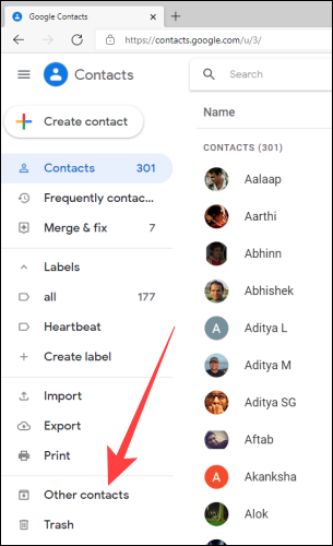 前往Google 通讯录页面 并使用联系人中不需要的电子邮件登录帐户。接下来,在左列中选择“其他联系人”。Gmail 多年来添加的所有电子邮件地址都会出现在那里。
