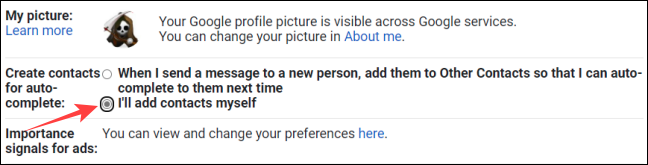在“常规”选项卡下,向下滚动到“为自动完成创建联系人”部分。正如我们上面提到的,Gmail 启用了将电子邮件地址自动添加到您的联系人的选项。选择“我将自己添加联系人”选项。