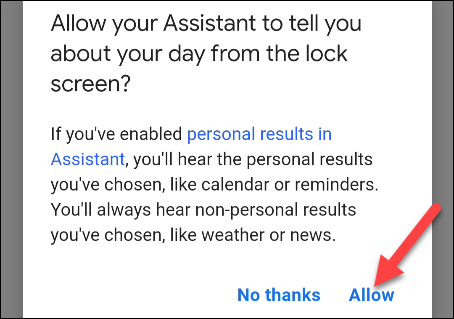 最后,会弹出一条消息,询问您是否要允许 Google Assistant 在屏幕锁定时执行这些操作。点按“允许”。