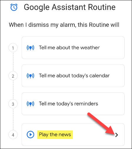 Google 助理例程创建屏幕将打开,其中包含一些预设。您可能希望保留其中一些,但我们正在寻找的是“播放新闻”。点击箭头图标以自定义新闻来源。