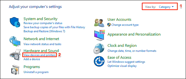 在窗口右上角的“控制面板”中,单击“查看方式”,然后从菜单中选择“类别”。这以类别模式显示控制面板选项。接下来,在同一个“控制面板”窗口中,找到“硬件和声音”部分,然后单击“查看设备和打印机”。