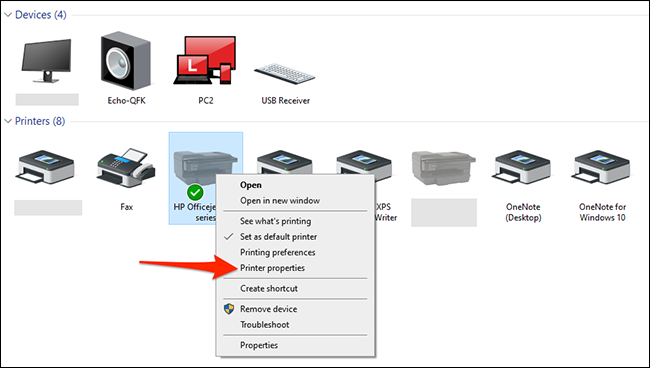 在打开的“设备和打印机”窗口中,向下滚动到“打印机”部分。在这里,右键单击要测试的打印机,然后在菜单中选择“打印机属性”。