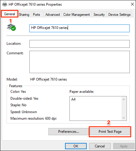 Windows 10 将打开打印机的属性窗口。在此窗口的顶部,单击“常规”选项卡。然后,单击窗口底部的“打印测试页”开始打印样本页。