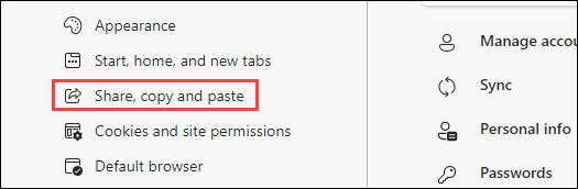 在 Edge 设置中,从侧边栏菜单中选择“共享、复制和粘贴”。