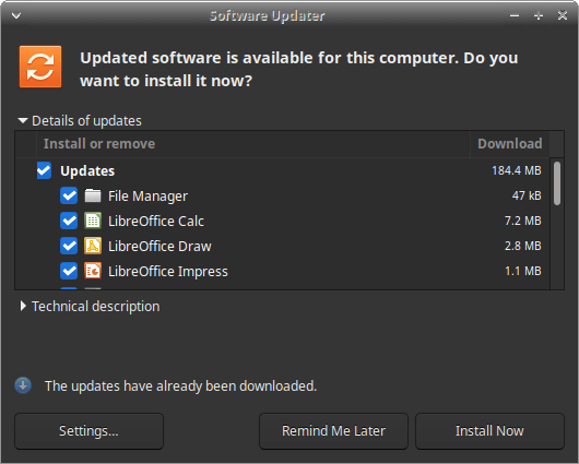我想提醒您,Software Updater 将安装系统更新、核心更新、安全更新和程序。总的来说,维护一台最新的机器是一个点击两次的过程。