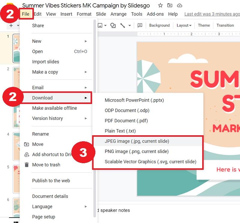 - 单击文件 > 下载。在这里,您将看到一个格式列表,您可以选择这些格式来下载幻灯片。