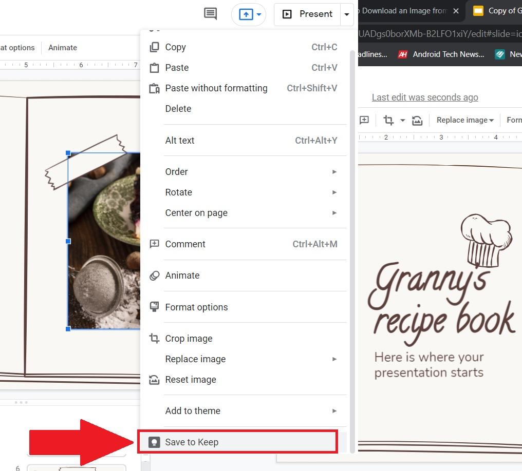 正如我们在开始时已经提到的,Google 幻灯片不允许您将幻灯片中的图像直接保存到 PC 上的本地文件夹中。但是,您可以复制图像并将图像保存到您的 Google Keep。从那里,您可以将图像下载或作为图像文件保存到您的 PC。您可以这样做: