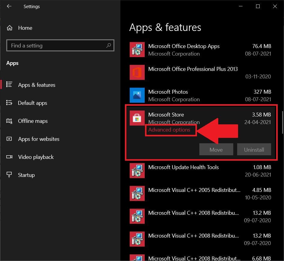 - 前往应用和功能部分并搜索 Microsoft Store。