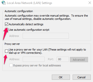 - 取消标记了“使用代理服务器为LAN ”复选框。您可以启用“自动检测设置”选项。