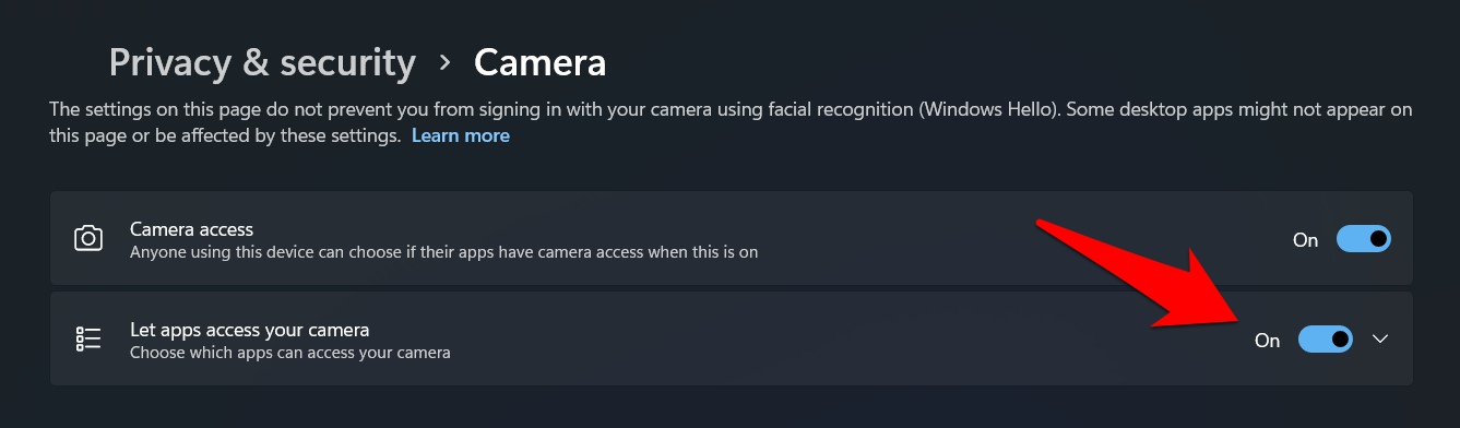 - 另一方面,如果您想阻止所有应用程序访问网络摄像头,请禁用此切换。